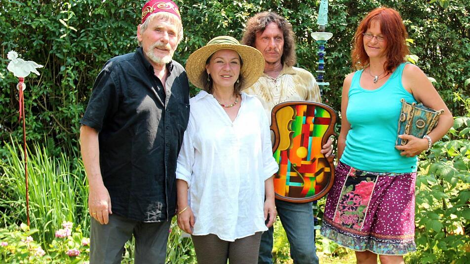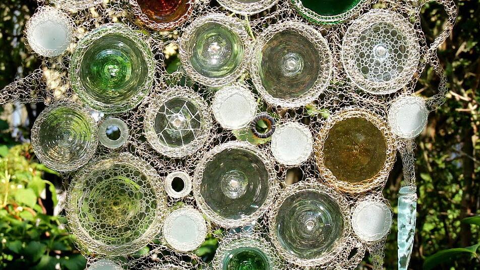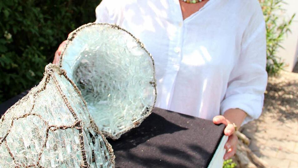 Sabine Nein (Glaskunst), die Gastgeberin, hat ihren Garten mit vielen gläsernen Kunstwerken geschmückt. "Für mich ist wichtig, das Glas als Kunstmaterial in unserer Gegend - einer Glas-Diaspora - zu präsentieren." Seit 30 Jahren kombiniert sie verschiedene Materialien wie Holz und Glas. "Das gibt eine gewisse Spannung, aber mein Arbeitsschwerpunkt liegt auf dem Glas, es ist die Seele eines jeden Objektes." Ihr jüngstes Werk - "das ist immer mein Lieblingsprojekt" - hat das Thema "Leben und Sterben im Barock". Die Basis sind zwei Kuhmaulkörbe, die das bäuerliche Leben im Barock symbolisieren. Erst die Arbeit der Bauern habe die barocke Pracht damals möglich gemacht.