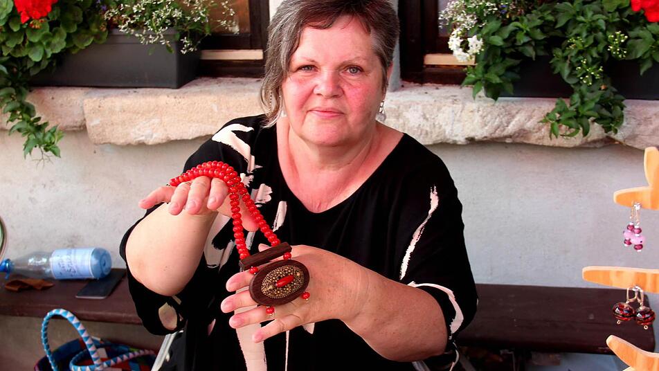 Mea B. Übler (Schmuck, Glasperlen) aus Burgthann vor ihren selbst designten Schmuckstücken. "Wer zum Glas findet, hat sich selbst gefunden", verrät sie den neugierigen Gästen. Mea hat zuerst eine fertige Kette im Kopf und dann kreiert sie die Perlen dazu.