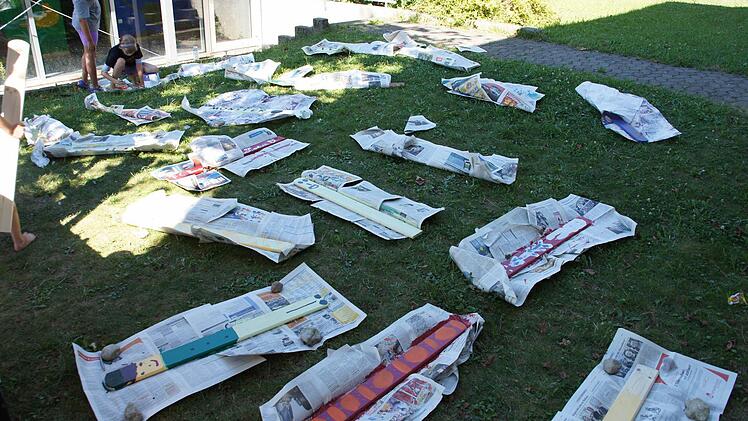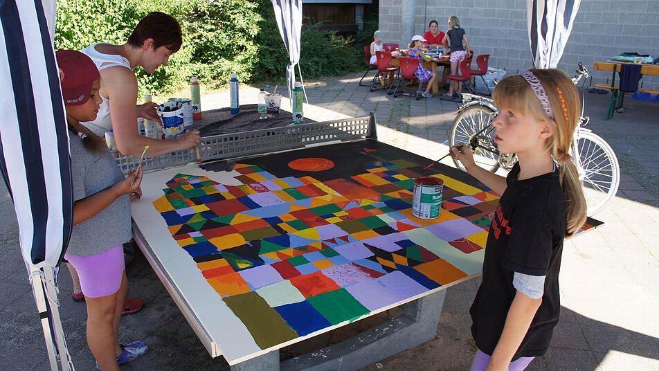 Rund 30 Buben und Mädchen entwarfen ihre eigene Königsburg. An dem Projekt konnten nur ein paar Kinder gleichzeitig malen, die anderen gestalteten in der Zwischenzeit Latten für die Hütte auf dem Pausenhof in Hemhofen.