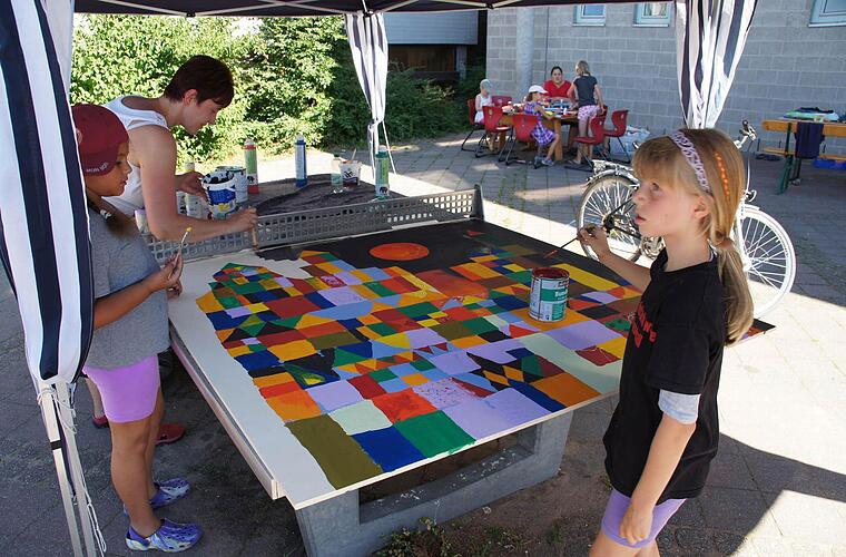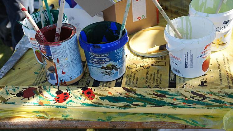 "Meine Zaunlatte möchte ich daheim im Garten anbringen", freut sich die neunjährige Hannah. Gemeinsam mit ihrer Freundin Celina hat sie eine weitere Latte mit der Aufschrift "2 Freunde" gemalert. Diese Latte darf später die Hütte auf dem Pausenhof zieren. Viele Kinder freuen sich, ihre Werke künftig an der Außenwand der Hütte wieder zu sehen. "Das macht den Pausenhof noch fröhlicher", findet der zehnjährige Florian.