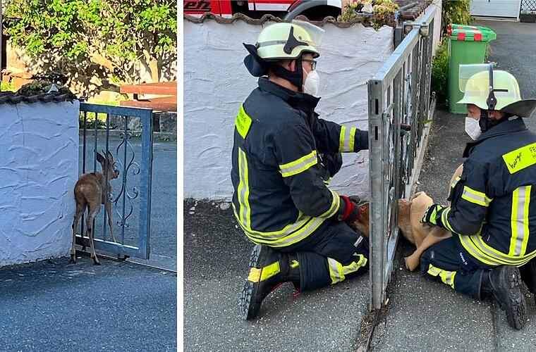 Das Tier hatte sich mit den Vorderläufen und dem Kopf durch ein Gartentor gezwängt "und ist dann mit den Hinterfüßen nicht mehr durchgekommen". Am Donnerstagmorgen (26. Mai 2022) musste deshalb die Feuerwehr anrücken, um das kleine Reh aus seiner misslichen Lage zu befreien.