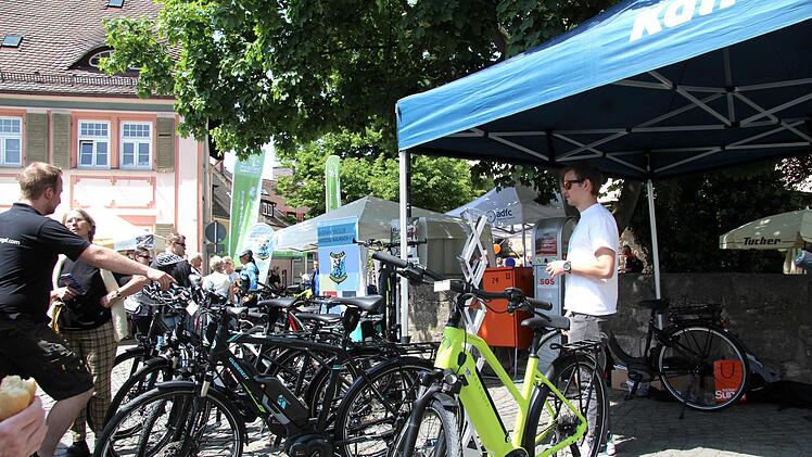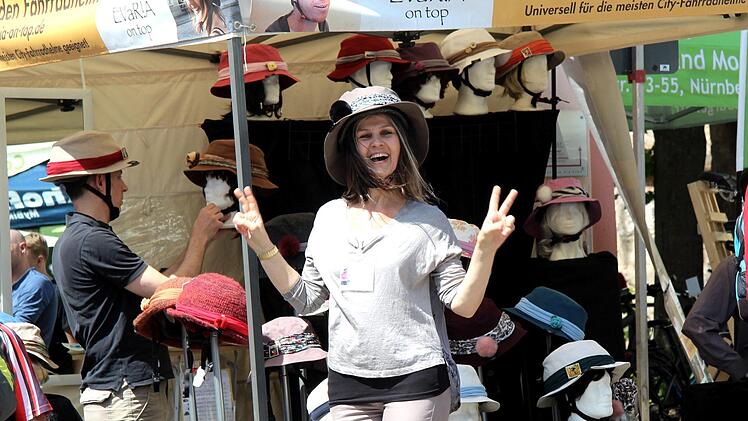 "Aufsteigen" hieß es wieder bei der neunten Fahrradmesse. Auf dem Markplatz und rund ums alte Rathaus präsentierten sich in diesem Jahr 19 Aussteller und neun waren zum ersten Mal dabei. So auch die Nürnbergerin Eva-Maria Burner von "Evaria on top" mit ihren modischen Hüten und Accessoires für Helme. "Man hat einen vollwertigen Helmschutz und eine viel schönere Optik", warb sie an ihrem Stand für ihren Kopfschmuck. Sie war am Ende der Messe auch begeistert. "Eine großartige Atmosphäre, viele nette Menschen und ich bin sehr zufrieden."