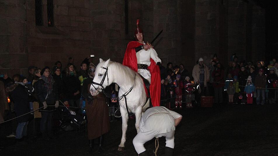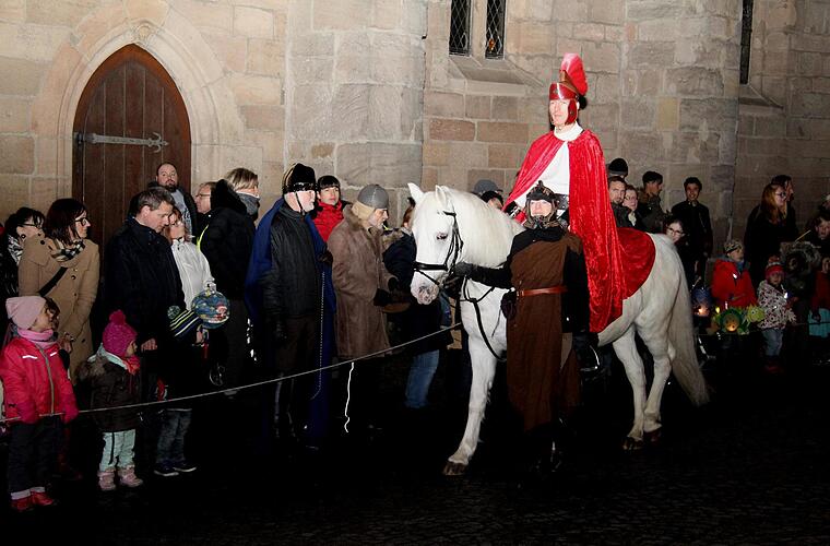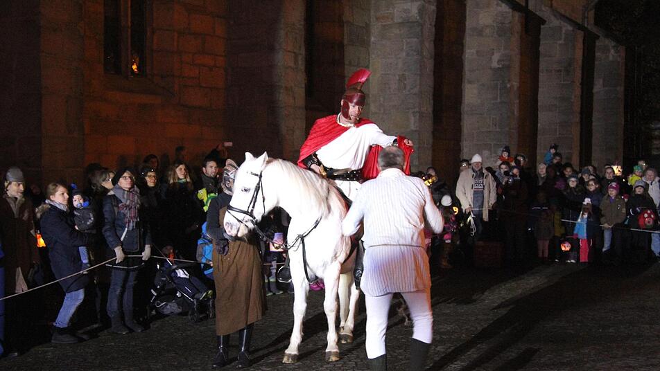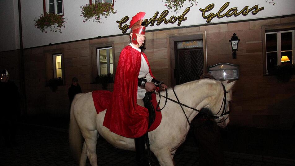 Das Interesse am Martinsritt ist ungebrochen, und Thomas Kotzer von der Förder- und Werbegemeinschaft konnte auf dem Kirchenplatz viele Kinder mit ihren Eltern begrüßen. Seit seinem 18. Lebensjahr kommt mit Martin Feucht ein "echter Martin" vom Reiterhof Hessenmühle zum Martinsritt. In diesem Jahr gab es eine Premiere, denn der jetzt 32-jährige frühere internationale Turnierreiter Feucht ritt den Schimmel "Andorra". Der bildhübsche Schimmel lebt schon seit fünf Jahren auf dem Reiterhof Hessenmühle und wird "Toni" gerufen. Der in Hessen gezogene Wallach stammt ab vom Vererber Apollo ab. Als Knappe begleitete die Apothekerin und staatlich geprüfte Bereiterin Gabriele Sehring-Castelli den Schimmel und seinen Reiter Martin Feucht. Mit dabei war auch der Pferdewirtschaftsmeister und Chef des Reiterhofes Hessenmühle, Roland Staudenmaier. Die Eskorte mit Wilfried Horstmann, Jutta Bornkamp und Ulrich Sigor sowie Karina Franke bewachte den Zug durch die Altstadt.