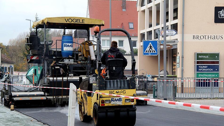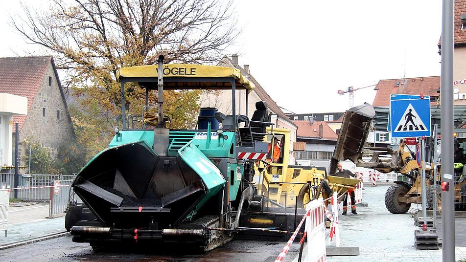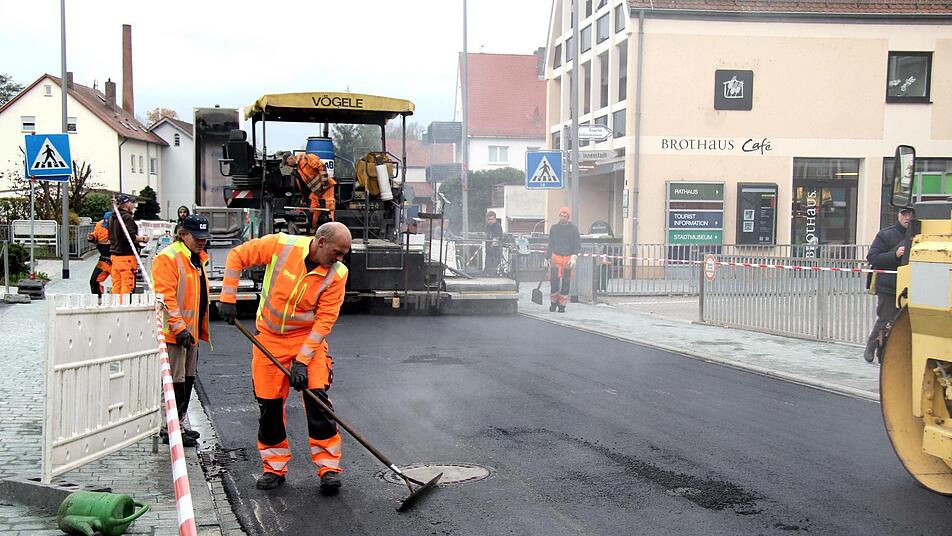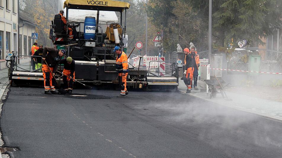 Am Montag waren noch die Kehrmaschinen im Einsatz und die Gullys mit Plastikfolien und der Kleber wurden aufgebracht. Am Dienstag wurde am Polizeikreisel mit dem Aufbringen der Schwarzdecke begonnen. Die Straße wurde beidseitig bis zur Steinernen Brücke mit Absperrbändern versehen und für die Fußgänger wurden Übergänge geschaffen. Beim Aufbringen der letzten Schwarzdecke herrschten nahezu ideale Temperaturen und der vorausgesagte Regen blieb auch aus. So sollte die Straße in einem Zug asphaltiert werden und der Wunsch der Stadt sich erfüllen, dass die Straße zur Martinikirchweih wieder befahrbar sein wird.