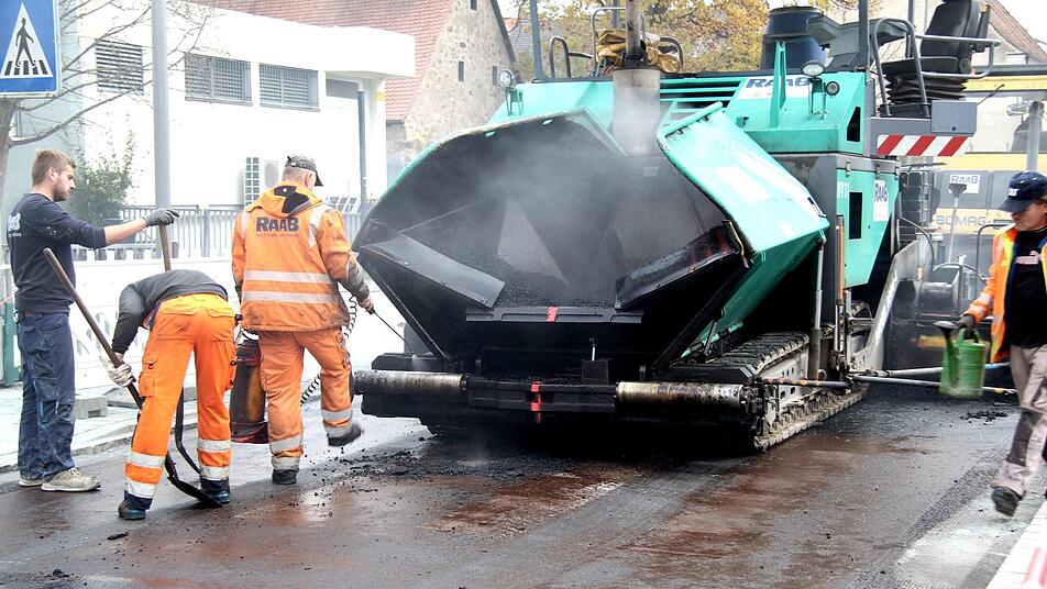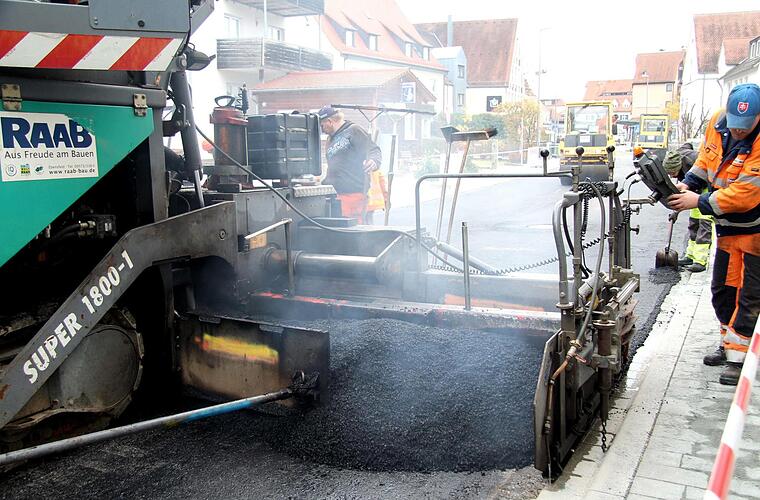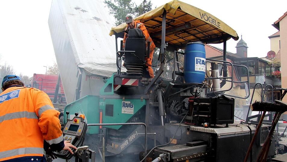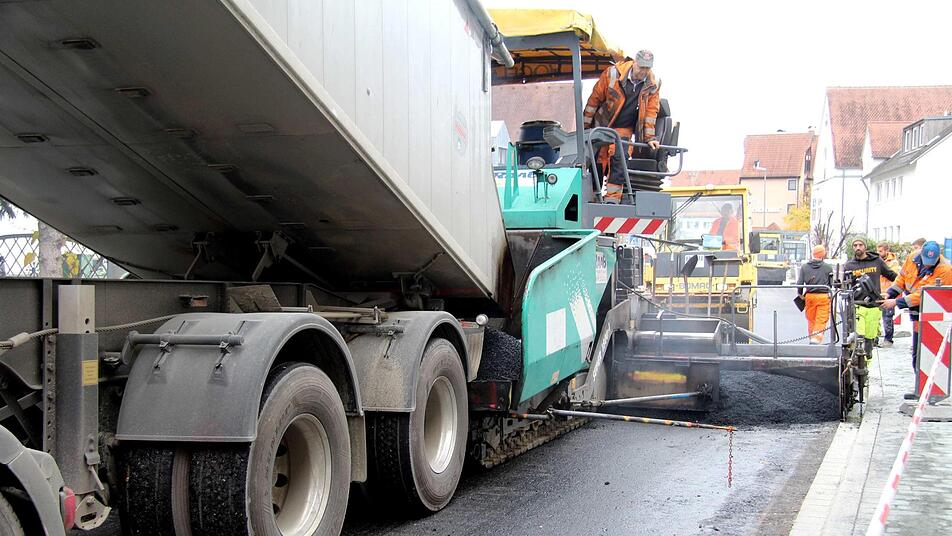 Zentimeter um Zentimeter bewegt sich der straßenbreite Asphaltfertiger nach vorne, wenn ein Sattelzug mit einer neuen Ladung ankommt. Die Anwohner der Straße "An der Schütt" können langsam aufatmen, denn das Ende der Bauarbeiten ist in Sicht.