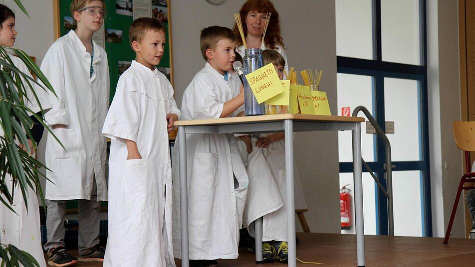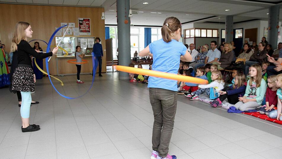 Wegen des unsicheren Wetters wurden Kinder, Eltern und Besucher in der Schulaula unterhalten. Martin Maes als Vater und Hortschüler Robert als Sohn führten durch die Darbietungen. So erzählte der Vater von den "coolen" Veranstaltungen, Ausflügen und Unternehmungen, die dann von den Hortkindern auf die Bühne gebracht und nachgespielt wurden. Von der Hausaufgabenbetreuung und Sport bis zu Tanz und den Neigungsgruppen reicht auch heute noch das Angebot. Auch eine kleine Modenschau mit der vor 25 Jahren aktuellen Kleidung zeigten die Kinder, und kleine "Forscher" führten Experimente vor.