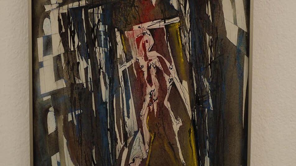 Adventliches oder gar Weihnachts-Kitschiges ist nicht dabei in dieser Vielfalt. So hat Alexander Czoppelt geometrisch-dominierte Kompositionen beigesteuert und als einzigen Jahreszeitenakzent einen Entwurf für ein Glasbild mit einer Madonnenfigur an die Eingangssäule hängen lassen. "Das ist eine Skizze, die ich vor fast 70 Jahren für meine Eltern gemacht habe. Eine kleine Einstimmung zum Fest", erklärt er seine "Abweichung". Vor Jahren auch hat Czoppelt einen flötenden Faun in Linol geschnitten und das lineare Bild mit ganz unterschiedlichen Farben gedruckt. Eine zartblaue Version gab er den Titel: Faun im Schneetreiben.