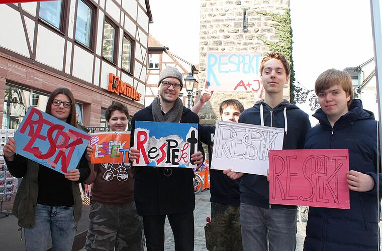Ausgerüstet mit Fotokameras, einer Selfie-Box und präparierten Karton-Schildern, auf denen das Wort "Respekt" zu lesen war, machten sich am Samstag ein paar Realschüler und Gymnasiasten auf den Weg in die Fußgängerzone. Dabei war es ihr Ziel, möglichst viele Fotos mit verschiedenen Menschen zu schießen.