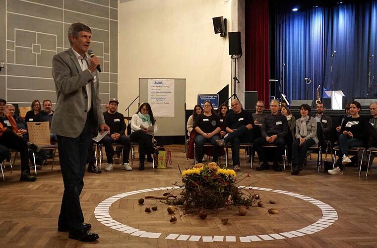 Der Ablauf des Abends dürfte für viele Teilnehmer neu gewesen sein. Sie bildeten einen Stuhlkreis, in dessen Mitte ein herbstliches Gesteck stand, das von hölzernen Gegenständen umringt war, die vom Moderator als "Sprechobjekte" bezeichnet wurden und die wiederum von einem Kreis mit weißen Karten umgeben waren. Für jeden Teilnehmer gab es eine Karte, die auf Geheiß von Axel Flinker aufgenommen wurde. "Drehen Sie die Karte um, betrachten Sie das Symbol und machen sich Gedanken darüber, was Sie dabei empfinden und denken." Dazu gab es in aller Stille eine Minute Zeit.