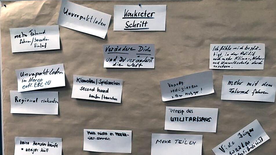 Unter dem Stichwort Einsichten gab es am Ende eine Vielzahl von Vorschlägen. "Gemeinsam schaffen wir es" hieß es an der Pinnwand, und dass die jungen Leute Recht haben, denn sie kämpfen für ihre Erde. "Ohne staatliche Regelung bleibt alles Bemühen eine Beschäftigungstherapie", war das Ergebnis einer Gruppe, die nächste forderte strengere Vorgaben der Politik. "Global handeln ist notwendig, wir haben nur eine Erde", hieß es bei einer Gruppe, und eine andere kam zu dem Ergebnis: "Es gibt viele Möglichkeiten, wir müssen es nur tun!"