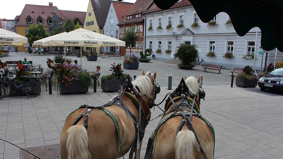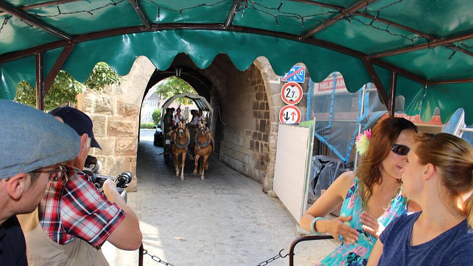 Gemütlich, mitunter etwas wackelig, wenn man im Planwagen mit Pferdegespann über Altstadtpflaster rollt und dabei die Sehenswürdigkeiten der Stadt aufs Bild bannen will. Karpfenkönigin Nina Hock saß auf dem einen Kutschbock, auf dem zweiten hatte Alexander Hock die Zügel in fest in der Hand, um seine Haflinger durch den Stadtverkehr zu lenken.