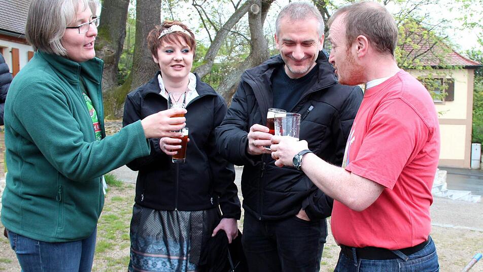 Trotz Regen hatten sich genügend Gäste - sogar aus Norwegen, Portugal, Polen und Kanada am Petersbecks Keller eingefunden, um die verschiedenen Biersorten zu probieren und diesen Tag gebührend zu feiern. Auch das Bierbrauerehepaar Caroline und Iain Price aus Castlebar, der irischen Partnergemeinde Höchstadts, hatte durch Freunde ein 30 Liter Bierfass nebst Zapfanlage und Biergläsern über die Irische See schippern lassen und alles kam gerade noch rechtzeitig an. "Gott sei Dank ist es kein Guinness!", freute sich einer der Besucher und versuchte das leckere - auch nach dem Reinheitsgebot gebraute - Bier der West Mayo Brewery.