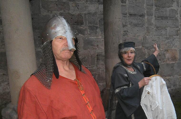 Er zeigte die Wappen, den Fürstenbau, wo früher die Kemenaten waren und alle bewunderte den Schwedenbrunnen als plötzlich der ehemalige Schlossherr Hermann von Stahleck (Reinhard Grasse) mit seiner Gemahlin Gertrud aus einem Seiteneingang stürzte. Beide fühlten sich nämlich auf ihrem Anwesen gestört. Er und seine Gattin erzählten den Störenfrieden jedoch gerne von ihrem aufregenden Leben sowie über Stadt, Burg und Tal.