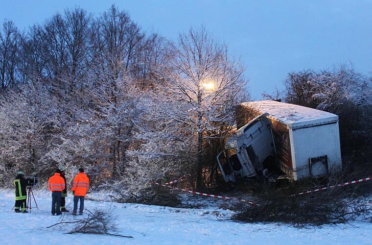 Nach ersten Ermittlungen der Polizei vor Ort war gegen 4.40 Uhr ein Richtung Nürnberg fahrender 40-Tonner auf schnee- und eisglatter Fahrbahn ins Schleudern geraten. Der 66-jährige Fahrer verlor die Kontrolle über seinen Sattelzug, kam von der Autobahn ab und rutschte eine steilere Böschung hinunter. Er überstand den Unfall zwar mit leichteren Verletzungen, wurde aber im Führerhaus eingeklemmt und musste aber von der Höchstadter Feuerwehr befreit werden.