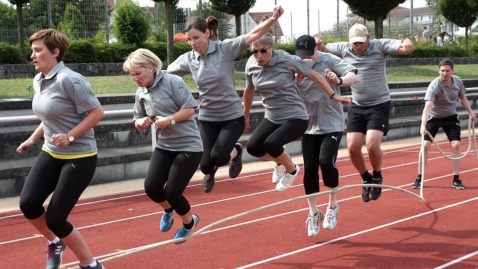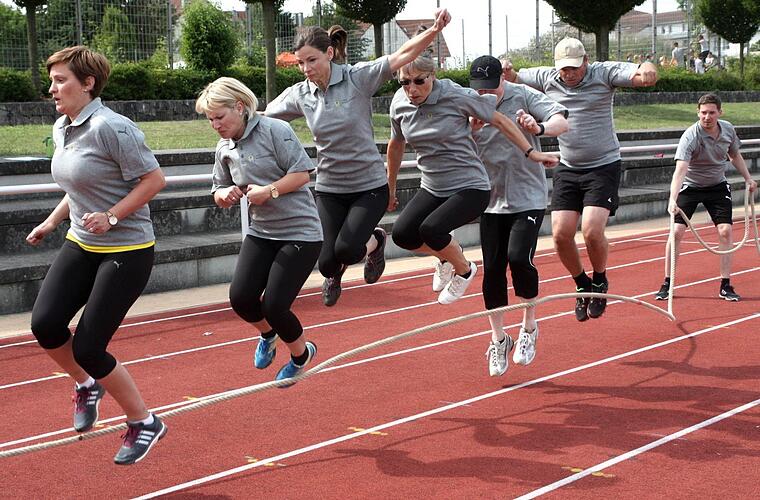 Die "Disziplinen" sind denn auch eher spaßiger Natur. Slalom mit gefüllten Wasserbechern im Drei-Bein-Staffellauf, Paar-Wasserball (bei diesen ersten beiden Aufgaben sind jeweils zwei Teammitglieder aneinander gebunden), Würfe mit verschiedenen Utensilien zielgenau in eine sieben Meter entfernt stehende Tonne, Stabweitsprung und Seilspringen XXL, bei dem zwei Teammitglieder das Riesen-Seil schwingen, über das die übrigen sechs gleichzeitig springen müssen.