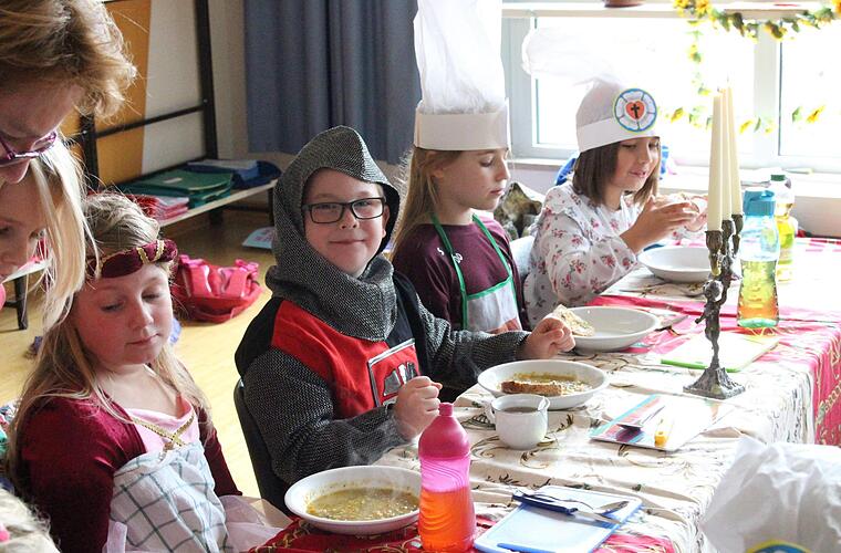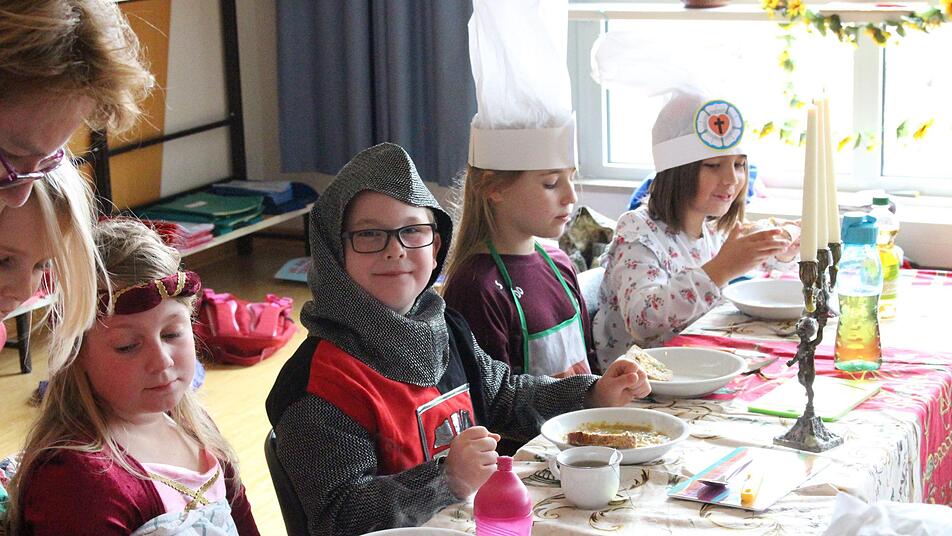 Denn Luther spielte in dieser Woche für die Anton-Wölker-Schule eine große Rolle. Anhand einer Projektwoche lernten die Grundschüler, wie Martin Luther lebte und arbeitete. Zum 500-jährigen Reformationsjubiläum haben die Kinder aber nicht nur gekocht wie im Mittelalter, sondern sich auch so angezogen. Verkleidet als Ritter oder Königin verspeisten sie ihre selbstgemachten Gerichte an einer großen Tafel. Dafür wurden die Schultische, auf denen normalerweise Mathehefte und Füller liegen, umfunktioniert und mit Leuchtern und Tischdecke gedeckt. "Die Kinder sollen mitnehmen, wie es in dieser Zeit war", erklärt Schulleiterin Rosmarie Wagner.