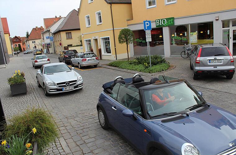 Wildes Parken im Visier Um zu prüfen, wie sich Parkplätze in diesem stark frequentierten Bereich auf den Verkehrsfluss auswirken, wurden am Dienstag zwei Stellflächen auf das Pflaster gepinselt. "Wir werden mit dem Arbeitskreis Verkehr die Auswirkungen genau beobachten", kündigt Günter Schulz an. Erst dann könne man daraus Schlüsse ziehen. Einig sei man sich im Arbeitskreis aber, auf die kleine Grünfläche verzichten zu können. Ende Mai soll dann mit den Anliegern in einer Bürgerversammlung besprochen werden, wie man das Areal, zu dem auch der geschotterte Parkplatz am Wohn- und Geschäftshaus gehört, gestaltet.