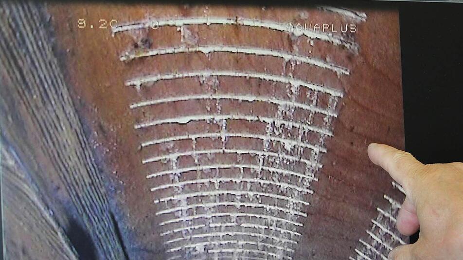 Letzte Kontrolle vor zehn Jahren "Immer wenn wir eine Pumpe ausbauen, lassen wir auch den Zustand des Brunnens kontrollieren", sagt Betriebsleiter Himpel. Beim Brunnen V war dies das letzte Mal vor zehn Jahren der Fall. Als jetzt die Kamera der Spezialfirma in die Tiefe tauchte, stießen die Experten auf mit Sand und Ablagerungen zugesetzte Schlitze, durch die normalerweise das Trinkwasser in das Rohr einströmt. Eine mechanische Reinigung war unumgänglich geworden.