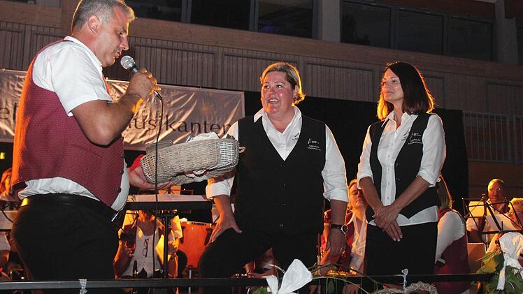 Gastgeschenke wurden am Ende auch noch ausgetauscht: die Altbächer hatten einige große Sektflaschen im Gepäck und kleine runde Magneten mit den Ortswappen der beiden Vereine. So können die Noten im Freien nicht mehr eigene Wege gehen. Dies war auch der Dank für die große Gastfreundschaft der Adelsdorfer Musikanten, denn die meisten des 50 Mann starken Blasorchesters logierten dieses Wochenende bei ihren Musikerfreunden. Die Adelsdorfer revanchierten sich mit gutem Frankenwein.