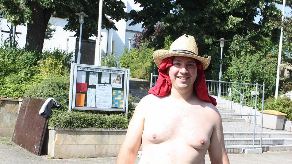 Glücks-T-Shirt um den Kopf Auch beim Baumaufstellen am Samstag fiel den Kerwasburschen etwas ein, nämlich ein neuer Schlachtruf: "Eins, zwei, drei - Oberkörper frei!" hieß es heuer zunächst, bevor das traditionelle "Hau ruck" erschallte. Bei über 30 Grad Hitze um 16 Uhr mussten schließlich Vorkehrungen getroffen werden, bevor man sich der zusätzlich schweißtreibenden Arbeit aussetzte. Dass nichts schiefgehen konnte, dafür ließ sich Ansager Matthias Mönius etwas einfallen. Sein "Glücks-T-Shirt" musste unbedingt dabei sein. Seit er es trägt, ist nämlich noch nie irgendetwas schief gegangen beim Baumaufstellen. Also band er es sich kurzerhand um den Kopf - ein bisschen ungewöhnlich, aber sicher auch als Schweißfänger nicht zu verachten. Funktioniert hat es jedenfalls. Mit vereinten Kräften gewichteten die mehr als 30 jungen Männer die 28,70 Meter - mit Zahlen nimmt man es in Aisch offensichtlich genau - hohe Fichte problemlos in die Höhe.