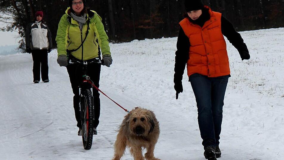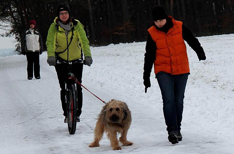 Fünf Menschen-Hunde-Teams waren auf dem verschneiten und recht kalten Übungsplatz anzutreffen. Nicolette Porscha aus Trautskirchen in der Nähe von Langenzenn wollte eigentlich solch einen Kurs bei ihrer Hundeschule absolvieren. Der kam aber doch nicht zustande. "Ich hab dann gegoogelt und fand die Homepage von Frau Brunk so toll, dass ich mich sofort angemeldet hab' - und mein Hund Louis und ich, wir haben es echt nicht bereut!", schwärmt sie, bevor sie einen Versuch mit dem "Downhill-Roller" wagt.