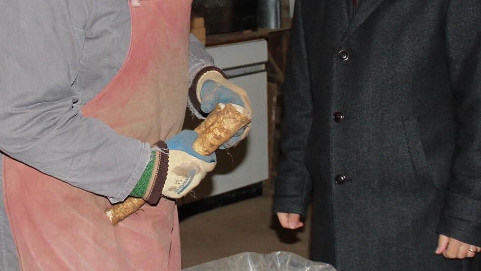 Das Grünzeug wird weggefräst, aber der "Erdmantel" außenherum bleibt und wird nicht abgewaschen. Dann wandert die Wurzel ins Kühlhaus, wo man sie fast 20 Jahre bei 0 bis +2 Grad unbedenklich lagern könnte. Gute Wurzelteile werden aufgehoben und im Frühjahr kommen sie als Stecklinge ins Beet. Der fertige Kren wird bei Haberkamms noch von Hand abgedeckelt, er ist also nur begrenzt haltbar. Deshalb wird am Hof nur ein Mal die Woche Meerrettich - natürlich maschinell - gerieben.