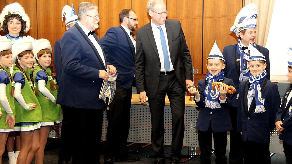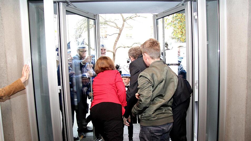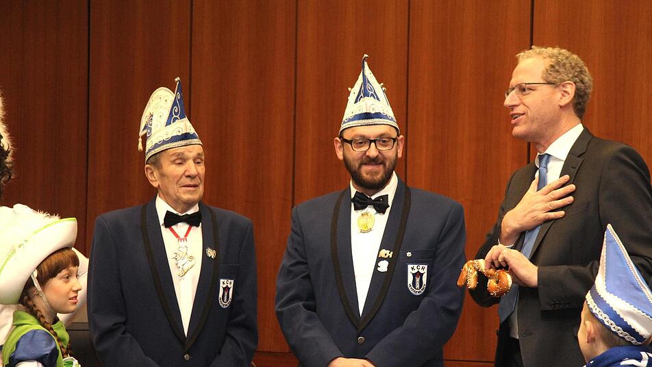 Zwar leistete Bürgermeister German Hacker (SPD) mit Verstärkung durch seinen Sohnes und die Vorzimmerdamen erbitterte Gegenwehr, als die Karnevalisten an der Tür rüttelten, musste sich aber geschlagen geben. Schließlich war der Rathausschlüssel das Ziel der Begierde. Im Sitzungssaal übergab er freiwillig den Schlüssel, allerdings als frisches, duftendes Laugengebäck. "Das ist der Schlüssel zum Kassenraum und da ihr Geld braucht, könnt ihr euch bedienen", bot das Stadtoberhaupt an. Doch die Karnevalisten ließen sich nicht täuschen.