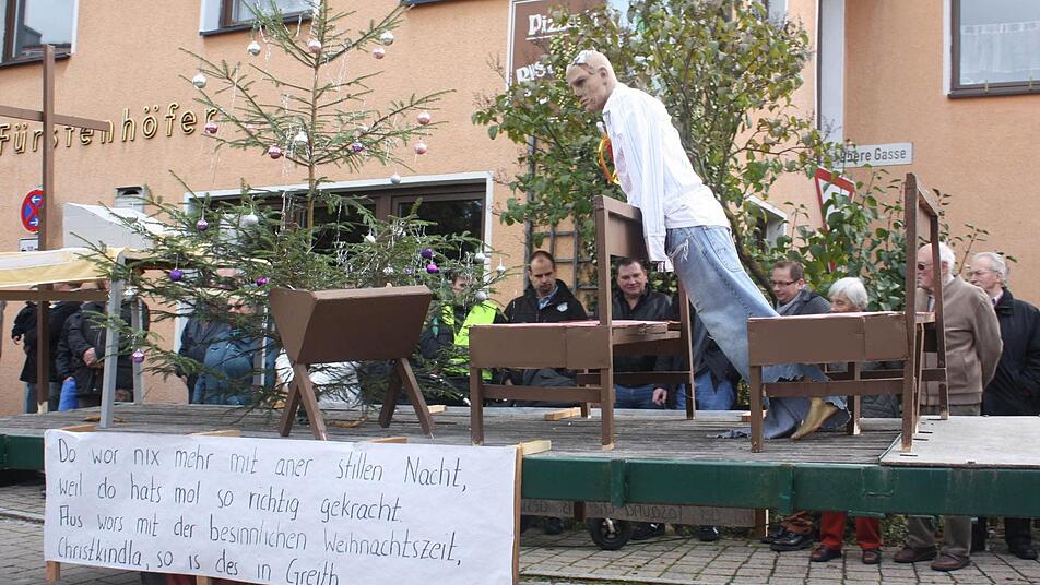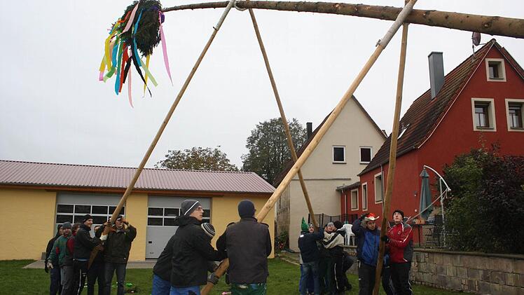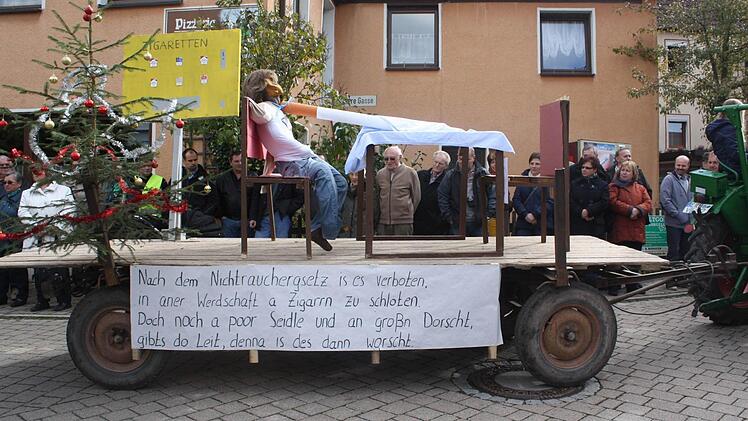 Ein gestohlenes Stromkabel nach der letzten Kirchweih - "Keine Ahnung, was die Diebe damit wollten" - , kleine Unannehmlichkeiten der Altburschen im vergangenen Jahr auf einer Nachbarkirchweih und manch anderes, was der eine oder andere so angestellt hatte, fanden jedenfalls ihren Platz im Spottkabinett. Das Aufstellen des 25 Meter langen Baumes ging heuer ohne Probleme vonstatten. Es hatte auch keiner versucht, ihn zu schälen. Die Flacheisen, die seit zwei Jahren nach einem bösen Kerwastreich als Schutz vor solch gefährlichem Tun am Stamm angebracht werden, haben wohl ihre Schuldigkeit getan.