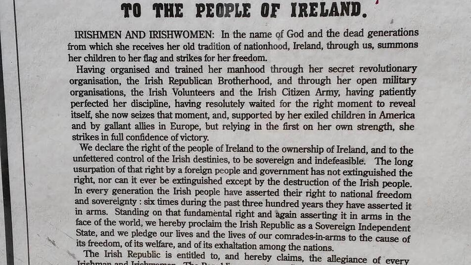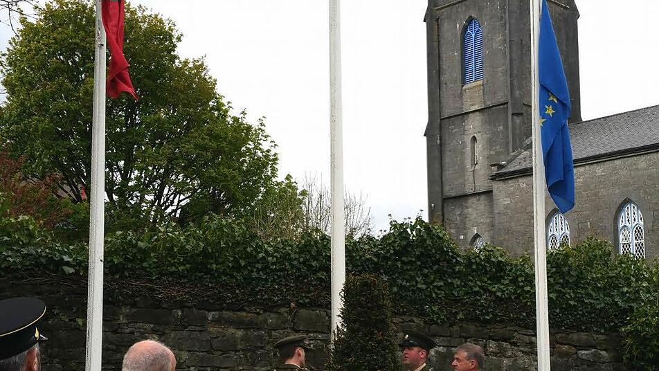 Feierliche Stimmung trat ein, als ein Offizier die Osterproklamation von 1916 verlas. Als ein Zeichen der Verbundenheit mit anderen in Irland lebenden Nationalitäten sprachen sechs Vertreter und Christian Kaspar als Vertreter der Partnergemeinde Höchstadt jeweils einen Absatz dieser Proklamation in ihrer Muttersprache. Die Fahnen wurden gehisst und dann erklang die irische Nationalhymne. Den ganzen Tag über herrschte Volksfeststimmung und der Nieselregen am Vormittag tat der guten Laune der Iren keinen Abbruch.