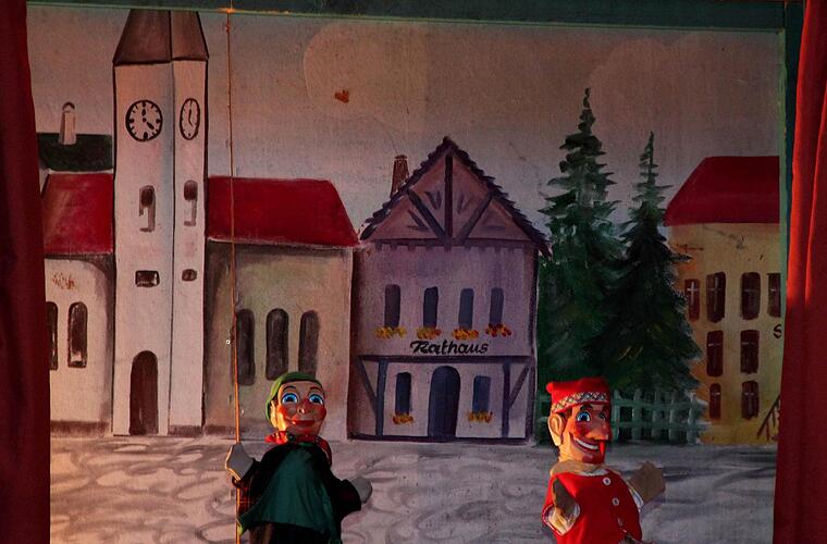 Bis zu acht Figuren kann der Puppenspieler in einem Stück bedienen - und er spricht alle Rollen auswendig. Das Bühnenbild ist noch das gleiche wie bei seinem Urgroßvater, natürlich etwas restauriert. Die Bühne selber musste er neu bauen. Tochter Jolina möchte so bald es geht als Prinzessin mitspielen. Sohn Liano hat diesmal die Aufführung verschlafen.