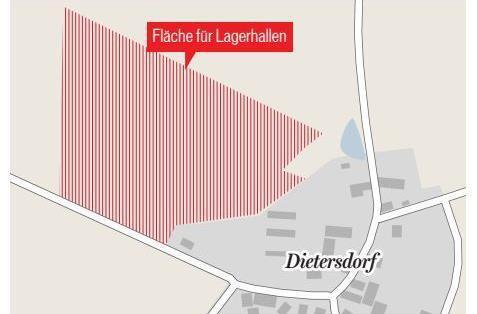 "Zu schnell, zu hopplahopp", fanden die Kritiker, die sich in der Sitzung gegen die Ausweisung eines Gewerbegebiets im Ortsteil Dietersdorf aussprachen. Außerhalb der Ortschaft, nordwestlich von Dietersdorf, will ein privater Grundstückseigentümer auf einer Fläche von fünf Hektar Lagerhallen errichten, um sie an das Unternehmen Martin Bauer zu vermieten.