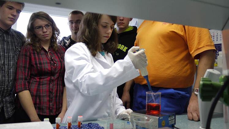 Weißer Chemikerkittel, Schutzhandschuhe. Sonja Poloczek füllt mit einer Pipette eine knallrote Flüssigkeit in Reagenzgläser. "Sie hat das Pipettieren schon raus", lobt Adelsdorfs Zweite Bürgermeisterin Jutta Köhler (SPD).