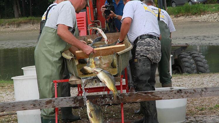 Schon einen Tag vor dem Medienereignis gab es ein "Entlastungsfischen". Die Temperaturen und der fehlende Wassereinlauf hatten dies zur Sicherheit notwendig gemacht. Unterstützt haben den Teichwirt dabei auch die örtlichen Feuerwehren, die mit ihren Pumpen Frischwasser nachfüllten.