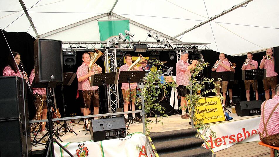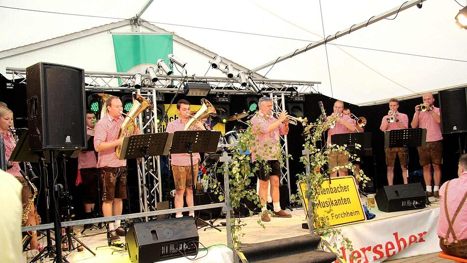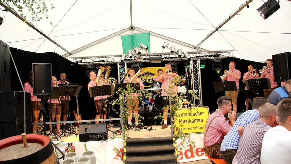 Die Leutenbacher Musikanten um ihren "Chef" Markus Geck setzten von Beginn an auf Stimmung, schließlich fiel die Großenseebacher Kirchweih in die Tournee zum 50. Jubiläum der Gruppe. Die Mischung aus Blasmusik und Partypower kam an und es wurde eine lange und gediegene Partynacht.