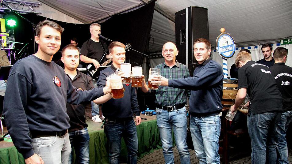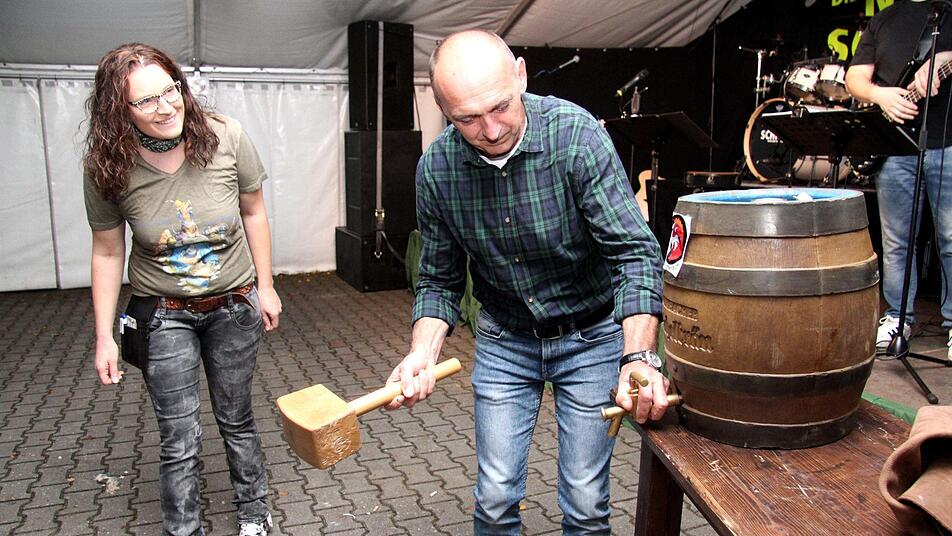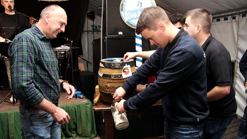 Bei der Bucher Kerwa war es in diesem Jahr ein Bieranstich mit Hindernissen: Der Zapfhahn passte nicht ins Fass und der Schlagzeuger von der Partyband "Die Nachtschicht" musste seinen Trommelwirbel dreimal abbrechen. Bürgermeister Heinrich Süß (UWG) bemühte sich redlich, das Fass anzustechen. "Alles zurück auf null, wir tun so, als wäre nichts gewesen", rief Bandleader Hans-Jürgen Lorenz ins Mikrofon, als auch beim zweiten Versuch kein Bier lief. Erst nach dem Anstich eines neuen Bierfasses konnte der Bürgermeister verkünden: "Ozapft is", und die sehnsüchtig wartenden Ortsburschen und -madla konnten ihre Krüge füllen.