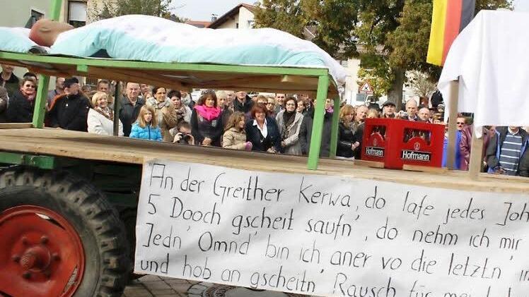 Ein Jahr nach Wagenmotiven gesucht Ob es um Ärger über den nun im zweiten Jahr bestehenden Platz des Festzeltes direkt an der Straße entlang der Christuskirche ging oder um "gschlamperte Damen", die sich ihre Vergnügungsstätte nun nicht mehr am Weiher suchen: Aufgepasst hatte man schon das ganze Jahr über, was so eines Kerwawagens würdig wäre. Nach der in Vestenbergsgreuth traditionellen Totenehrung mit Kranznieedrlegung am Kriegerdenkmal zog der Zug wie gewohnt bis zum Vergnügungspark. Musikalisch begleitet wurde er von den Taschendorfer Musikanten.
