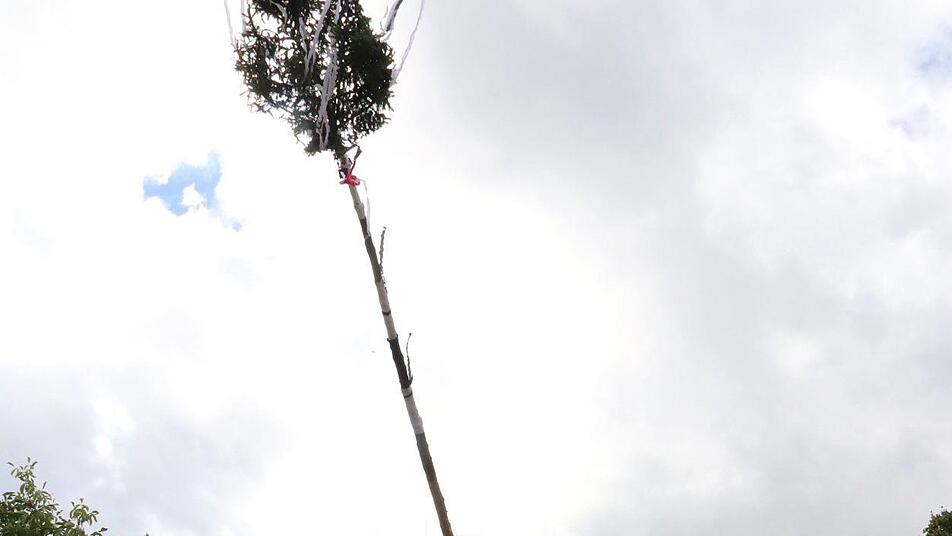 Ob die Regendusche zwischendurch nur eine angenehme Erfrischung oder eher eine Erschwernis war, "waas ma ned gwies". Aber nach genau 100 Minuten stand die Fichte wie eine Eins und trotzte den drohenden Regenwolken. Maskottchen "Frydolein", der Aascher Karpfen, schaute genauso interessiert zu wie Lina, Julia, Maximilian, Sebastian und Noah, die stolz verkündeten, dass sie auch einmal Aascher Kerwasmadli oder -burschen werden wollen. Dafür muss man aber mindestens 16 Jahre alt sein - und das hat noch etwas Zeit.