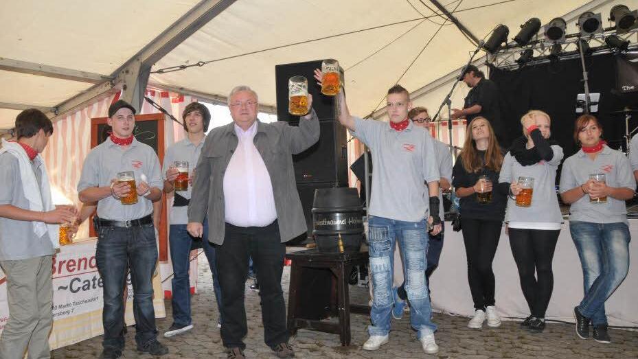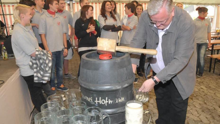 Bürgermeister Erwin Schopper, der das erste Fass Bier anstach, zeigte sich mit dieser Zählweise nicht ganz einverstanden. "Es waren nur drei Schläge, der vierte war nur ein Sicherheitsschlag", entgegnete er den Ortsburschen. Doch egal, ob drei oder vier Schläge, wichtig war, dass der Gerstensaft in die bereitstehenden Krüge floss und beim Anstich kein Tropfen daneben ging.
