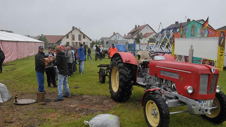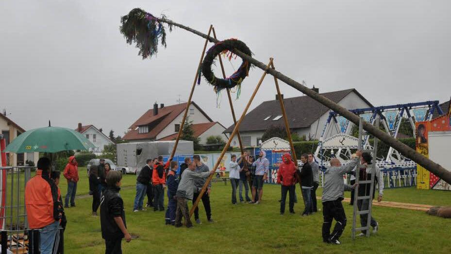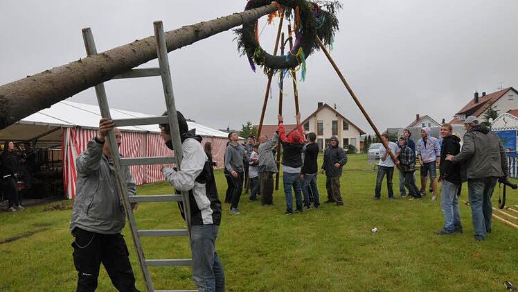 Um 14.30 Uhr war es soweit. Unter den Augen zahlreicher Schaulustiger galt es, dem Kommando von Peter Eigler folgend bei strömendem Regen den von den zehn Orstmadle bunt geschmückten Baum in die Senkrechte zu bringen.