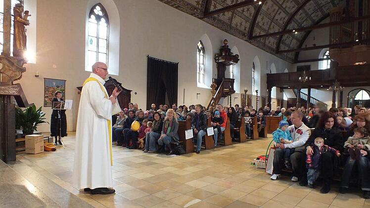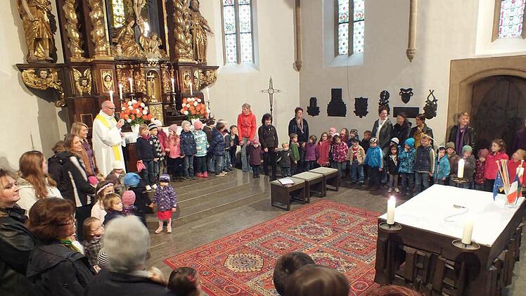 Zur Feier gehörte auch ein Gottesdienst mit den Kindern, ihren Eltern und den Erzieherinnen in der Stadtpfarrkirche St. Maria Magdalena. Da thematisierte Stadtpfarrer Helmut Hetzel wichtige Punkte im Jahreslauf mit den Kindern. Er nannte den Martinstag sowie Weihnachten und Ostern. Mit kleinen Fähnchen ausgestattet symbolisierten die Kinder die unterschiedlichsten Nationalitäten. "Der Heilige Geist wirkt mit unterschiedlichen Sprachen", erklärte Pfarrer Hetzel den Sinn hinter dem Symbol.