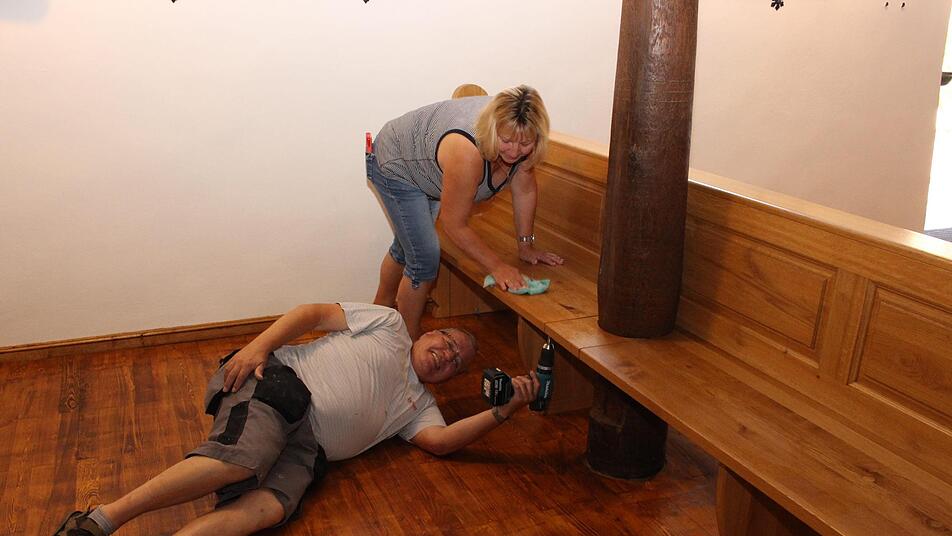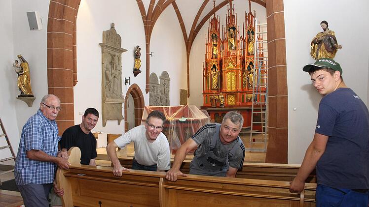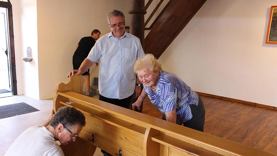 34 helfende Hände hatte Wichert auf ihrer Liste. Vereine und Gremien hatten zur Mithilfe aufgerufen. Mit Erfolg. Sogar die fast neunzigjährige Maria Wichert half, die Bänke vom Staub zu befreien. Der Ortsgeistliche Pater Gabriel Ramos Valiente legte beim Auf- und Abladen selbst Hand an. Mesner Andreas Zöbelein versorgte die Helfertruppe mit kühlen Getränken und mit Brotzeit, die der Wachenrother Unternehmer Hans Gumbrecht gestiftet hatte.