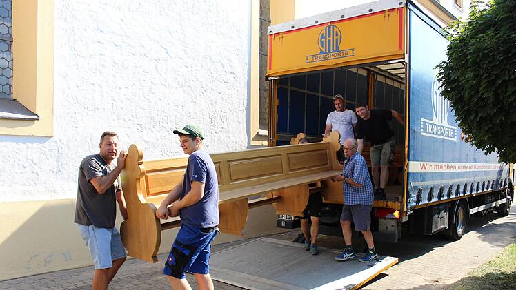 Schwer waren die Eichenbänke, das wurde beim Abladen vom Laster deutlich. Mehrere Männer mussten zupacken, um das Kirchenmobiliar vom Lkw, den die Zimmerei Hemmerlein aus Elsendorf zur Verfügung gestellt hatte, abzuladen.