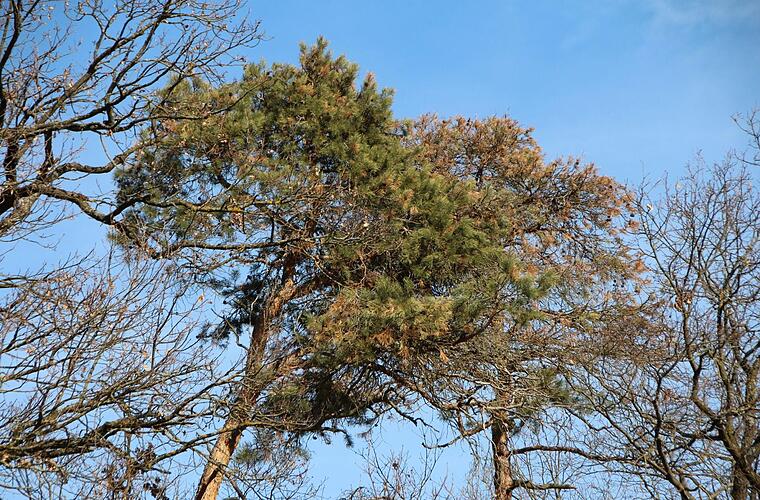 Der Klimawandel schaffe beste Bedingungen für Nadelbaum-Schädlinge, die einzeln bei normalem Klima keine große Gefahr verursachen würden, zusammen aber für ganze Bestände tödlich sein können. Diplodia, ein Pilz, der Wärme und Trockenheit liebt, hat die Kiefernnadeln ganzer Bestände von grün nach rötlich verfärbt, was die Bäume nicht überleben. Dazu setzen Kiefern-Prachtkäfer, Buchdrucker, Waldgärtner und die schmarotzende Mistel-Pflanze den Kiefern und Fichten ebenfalls zu. Umgebaut muss werden, so die allgemeine Maxime. Auch wenn die Holzpreise wegen des reichen Angebots an wegen Käferbefalls gefällten oder vom Sturm umgewehten Bäumen im Sinkflug sind, sollten die Waldbauern bald zur Säge greifen.
