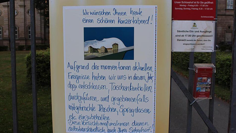 Nein, nichts war wie immer! Es begann schon beim Einlass zum Ehrenhof von Schloss Weissenstein: Sicherheitsdienste kontrollierten akribisch jede Tasche . Dennoch - in Zeiten von Angst und Terror sind solche Vorkehrungen selbst bei der Schloss-Serenade im ländlichen Pommersfelden durchaus verständlich.
