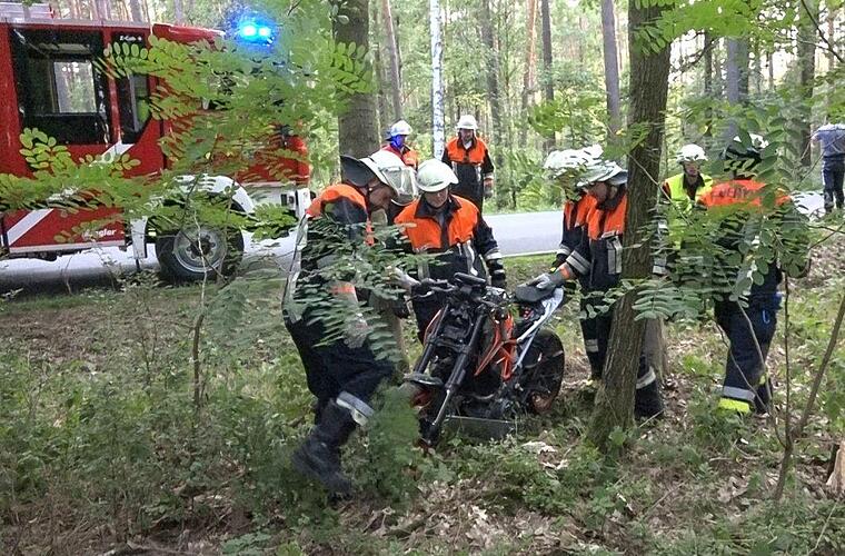 In einer Kurve kam der junge Mann alleinbeteiligt in einer Kurve nach links von der Fahrbahn ab und schlitterte an mehreren Bäumen vorbei, bevor das Motorrad gegen einen Baum prallte und Totalschaden erlitt.
