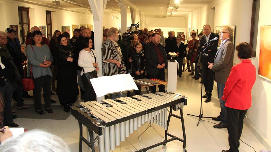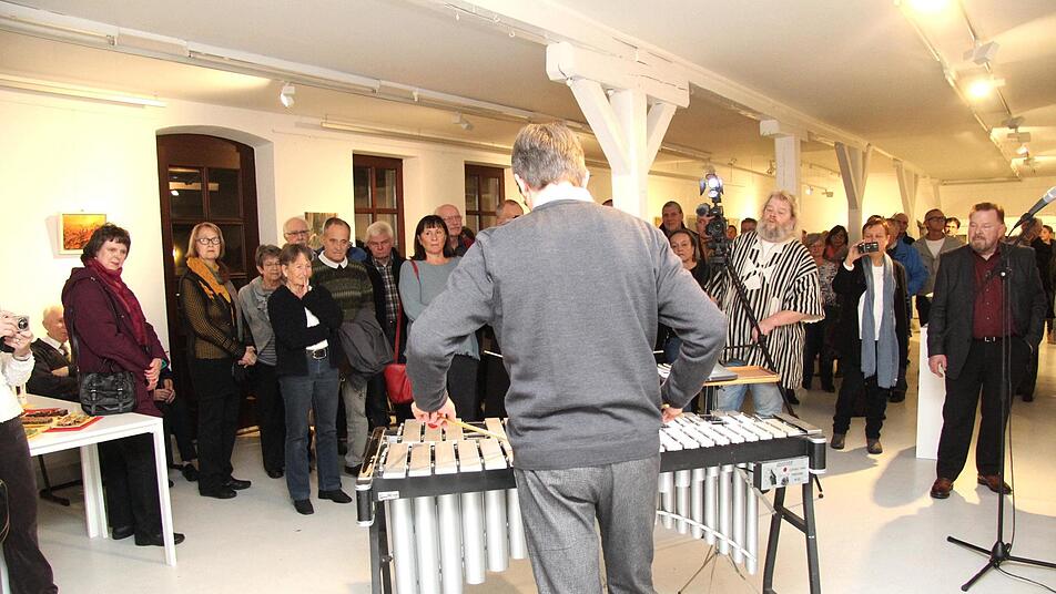 Michael Ort spielte auf dem Vibraphon drei noch unbenannte Kompositionen, zog dabei auch einen Geigenbogen über das Vibraphon und erzeugte dabei ungewohnte und selten gehörte Töne. Die sehenswerte Ausstellung regt nicht nur zum Nachdenken an, sondern bietet auch Impulse und Stoff für Diskussionen.