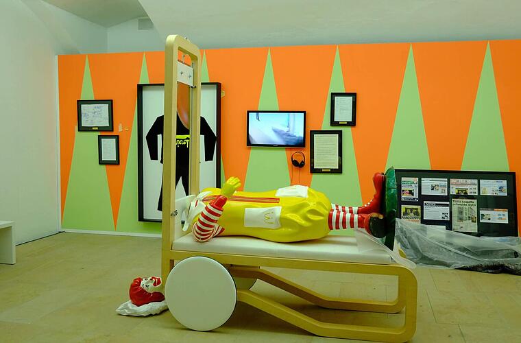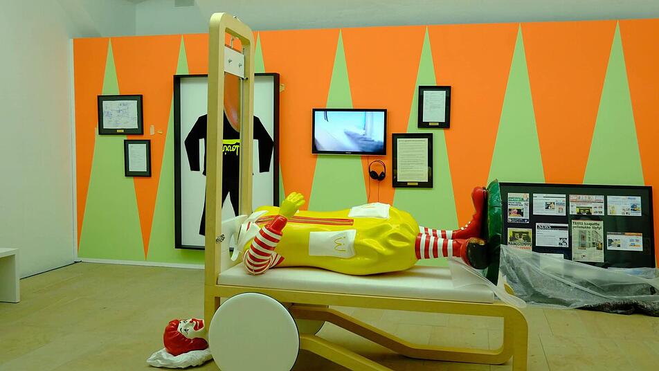 Am Ende der amüsanten Ausstellung, die mit allerlei Multimedia aufwartet, versteht man schnell, warum der finnische Künstler Jani Leinonen dem werbewirksamen Clown einer amerikanischen Burgerkette den Kopf auf der Guillotine abgeschlagen hat. Auf dem Bildschirm wird gezeigt, wie der Werbeclown aus der Frittenbude entführt wird. Das Video der Entführer ist auch zu sehen.