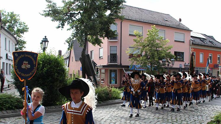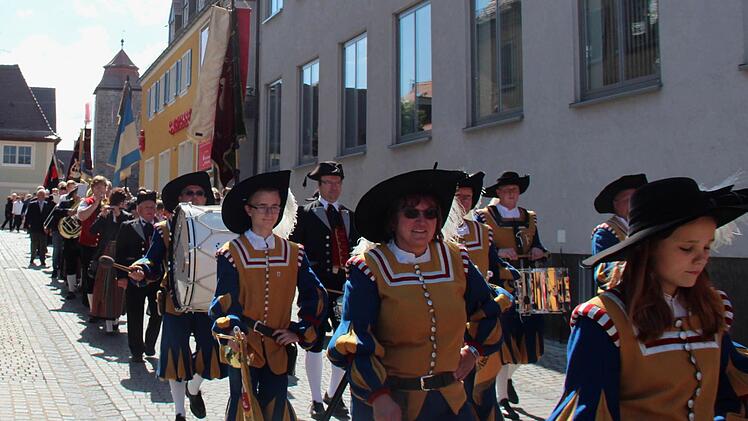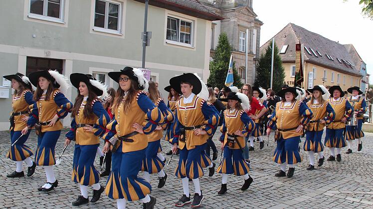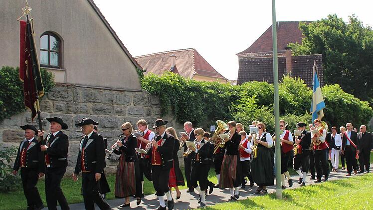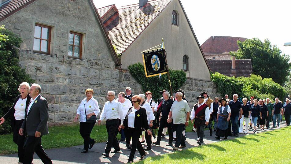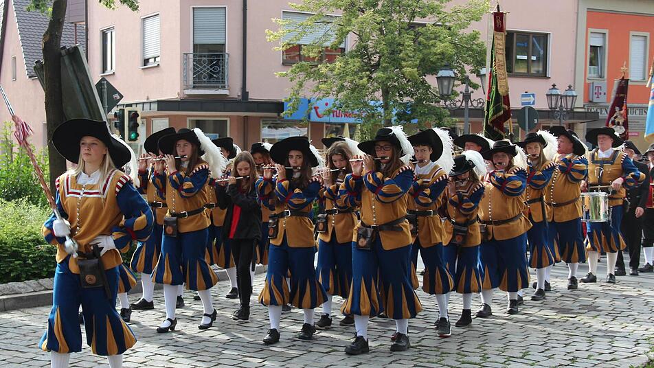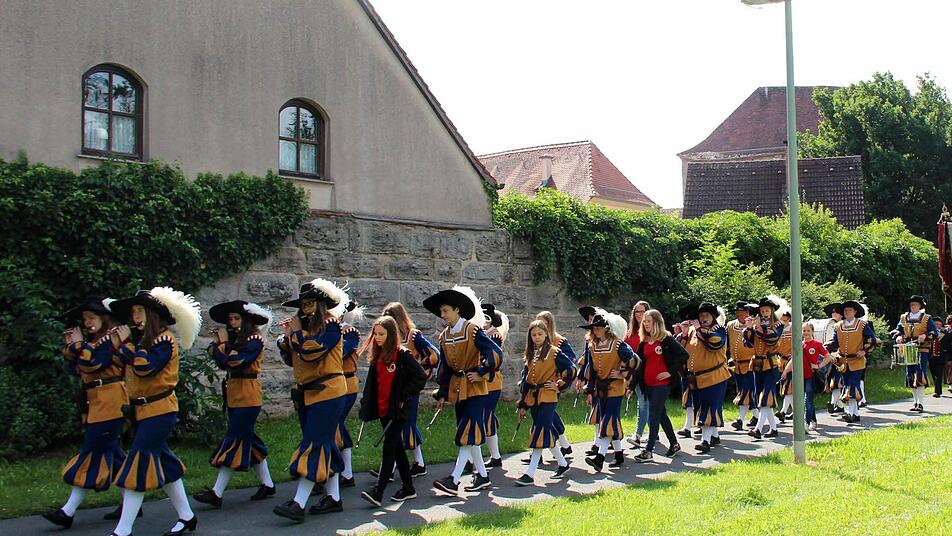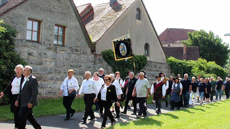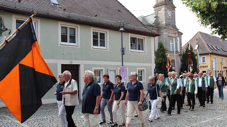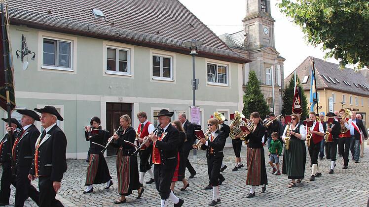 Die Höchstadter Kerwa lebt! Dies zeigte sich am Montagmorgen, als sich bei strahlendem Sonnenschein um 8.45 Uhr ein langer Kirchenzug mit vielen Vereins- und Fahnenabordnungen am Schillerplatz, angeführt vom Spielmannszug und der Höchstadter Blaskapelle formierte, um zum Gedenkgottesdienst in St. Georg zu marschieren.