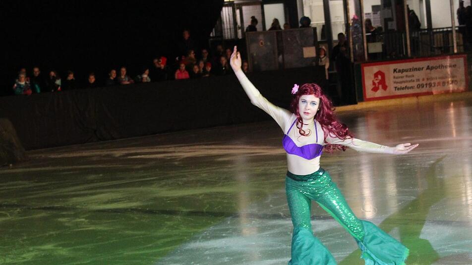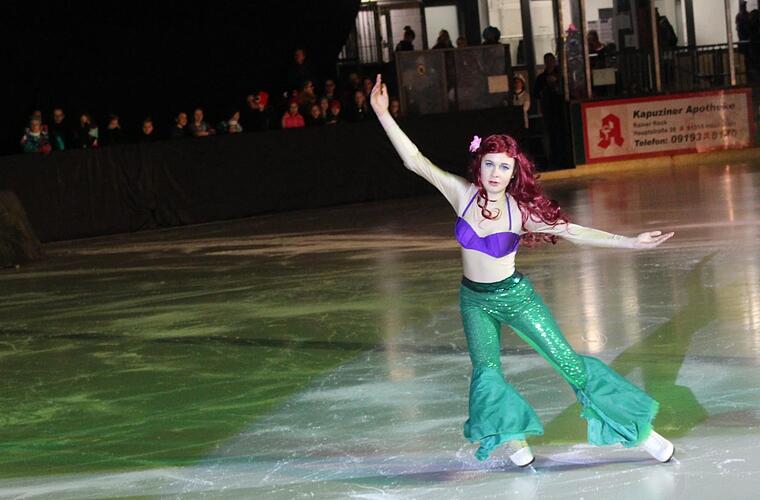 Rund 200 Akteure standen am Samstag auf dem Eis, um den Zuschauern in aufwendigen Kostümen ihr Können zu präsentieren. In beiden Erzählungen geht es um eine Liebesgeschichte: Arielle träumt schon immer davon, einmal ein Mensch zu sein, doch ihrem Vater Triton gefällt diese Idee gar nicht. An Land lernt sie dann durch Zufall den Prinzen Eric kennen, den sie letztendlich auch heiratet. Eine Geschichte, die von Freiheit und dem Mut zur Liebe handelt. Und ebenso schön erzählten sie auch die Eiskunstläufer nach, ganz ohne Worte, nur durch ihre Kür. Die Protagonisten dabei waren immer unterschiedliche: Aber egal, ob Kindergruppen oder Erwachsene, mit ihrer Performance überzeugten sie die rund 1000 Zuschauer im Eisstadion.