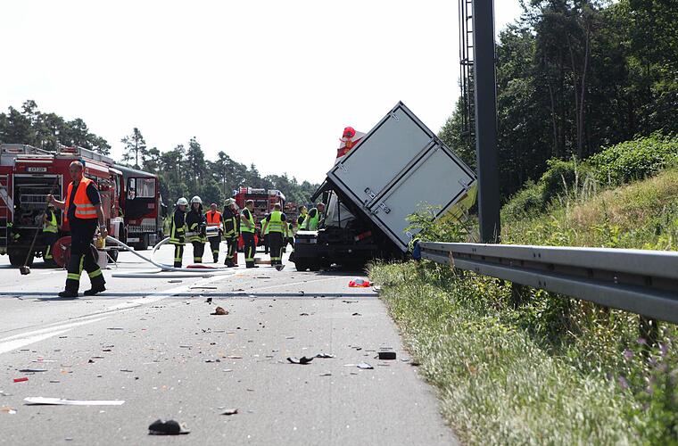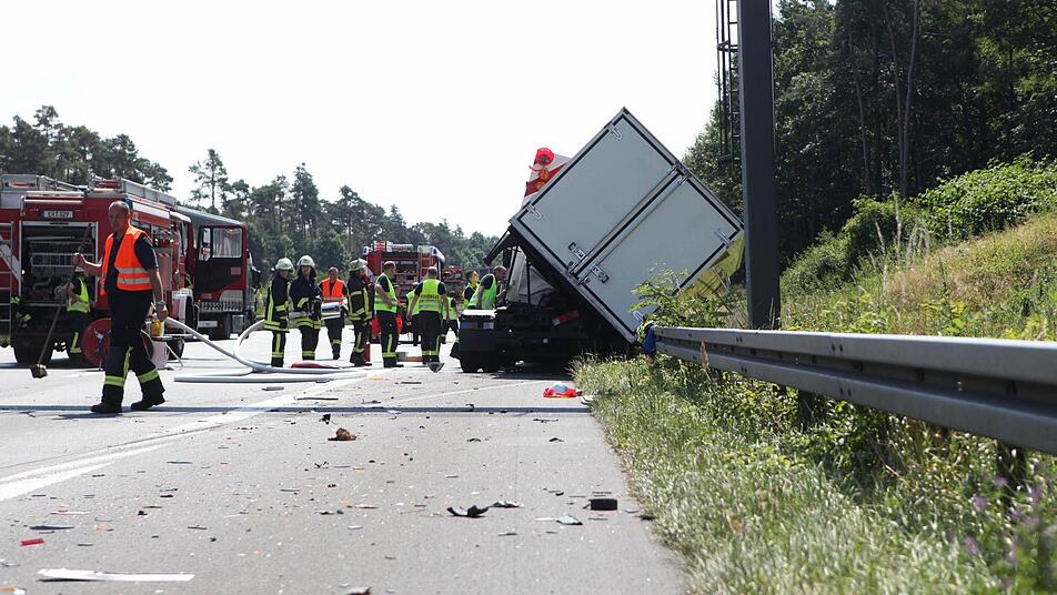 Aus noch ungeklärter Ursache krachte ein mit gekühlten Lebensmitteln beladener Lkw in einen Sicherungsanhänger der Autobahnmeisterei, bestätigt ein Sprecher der Verkehrspolizei Erlangen.